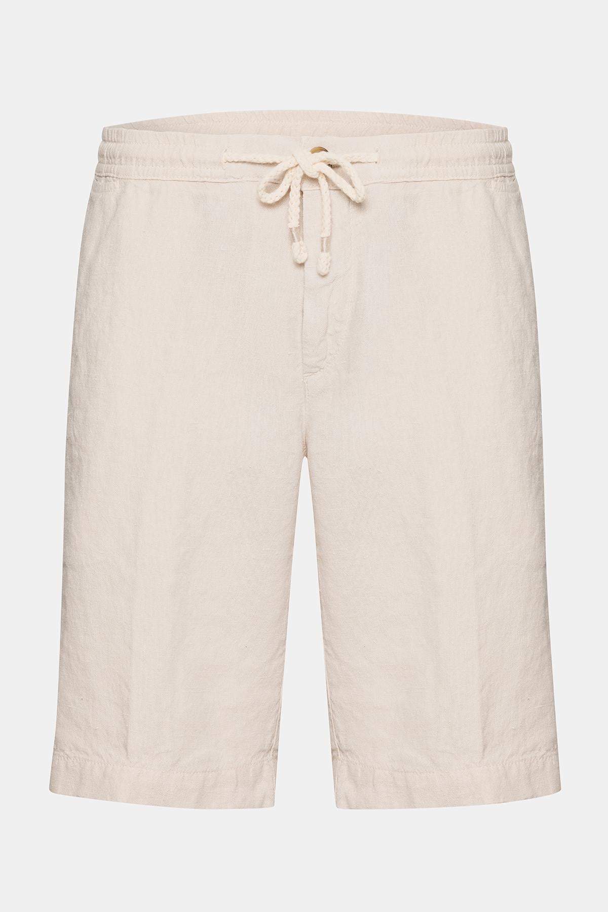 Erkek Bej Beli Lastikli Bağcıklı Keten Şort