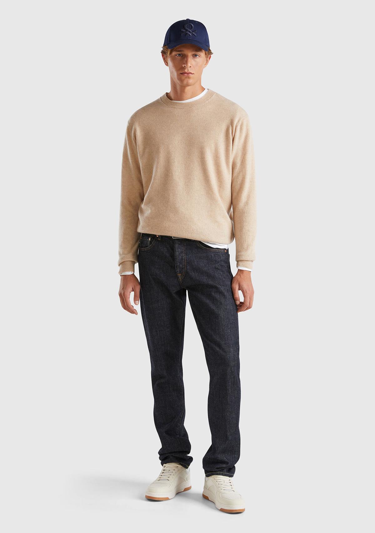 Erkek Bej Melanj %100 Kaşmir Normal Kesim Ribanalı Yuvarlak Yaka Kazak. Keçi Yünü İçerir