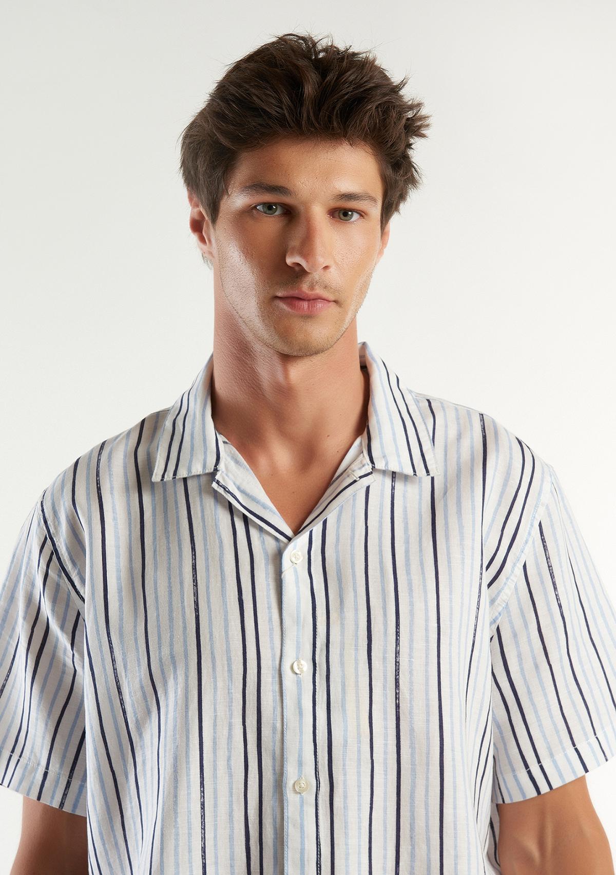 Erkek Beyaz Mix Keten Karışımlı Desenli Kısa Kollu Gömlek