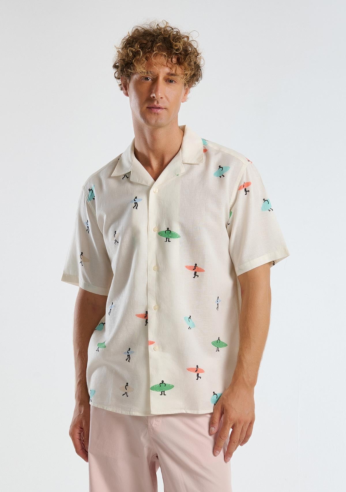 Erkek Beyaz Pamuk Keten Karışımlı Desenli Bowling Yaka Kısa Kollu Gömlek