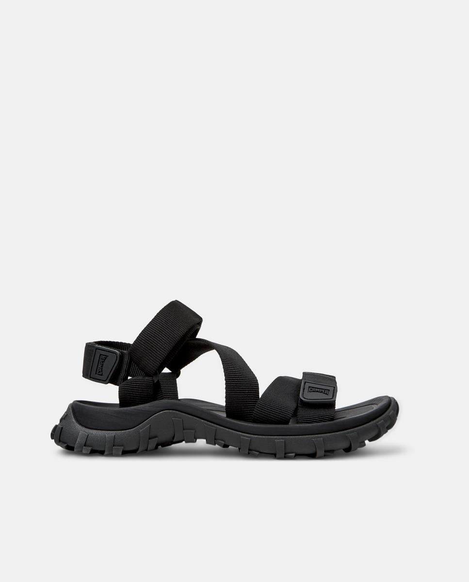 Black recycled PET men's sandals with hook & loop system, EVA midsoles, and Vibram outsoles.