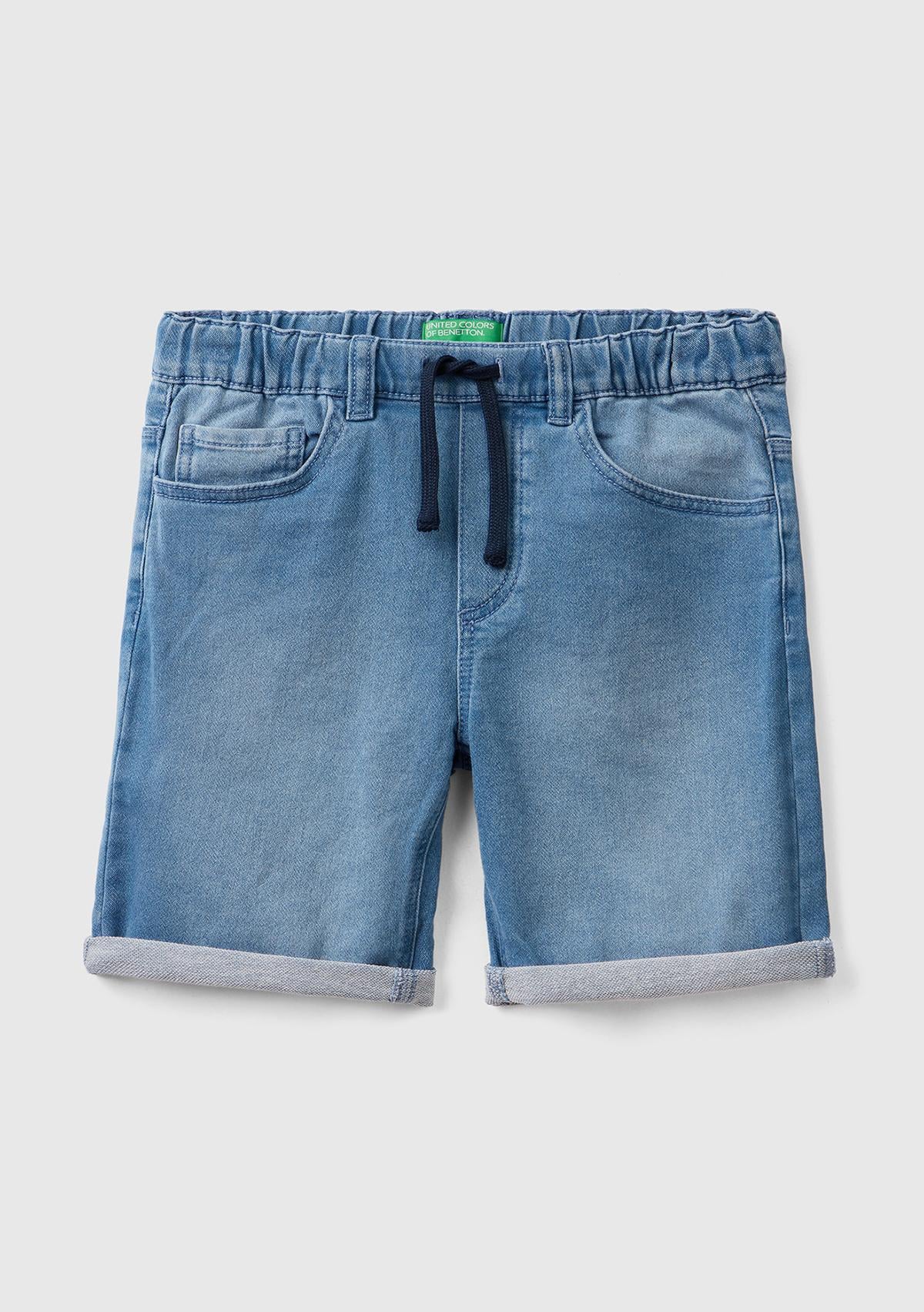 Erkek Çocuk Açık Mavi Logo İşlemeli 5 Cepli Beli İpli Ağartılmış Bermuda Şort