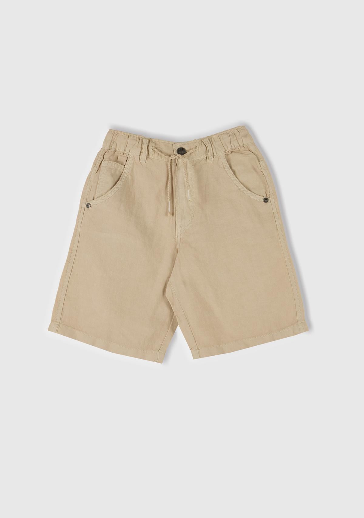 Erkek Çocuk Bej Liyosel ve Keten Karışımlı Büzgü İpli Cepli Bermuda Şort