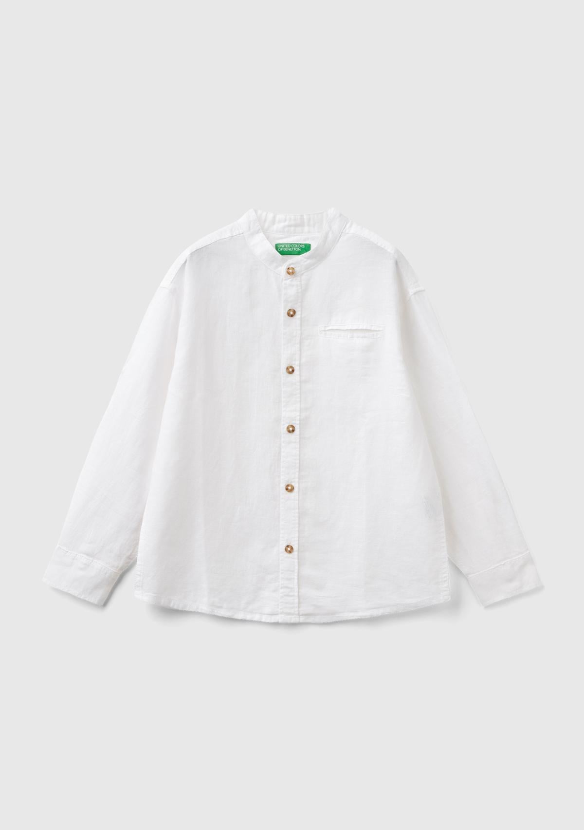 Erkek Çocuk Beyaz Keten Karışımlı Cebi Biyeli Hakim Yaka Katlanan Kollu Gömlek