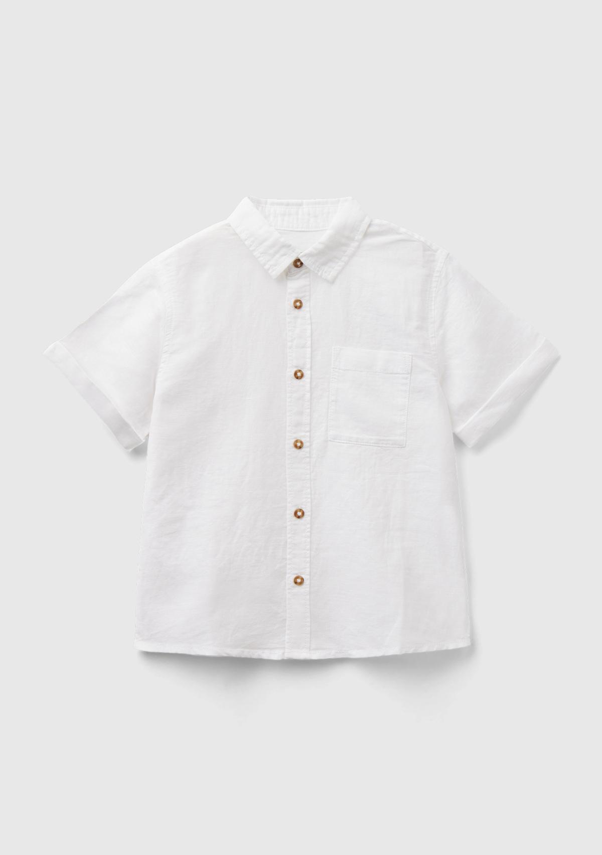 Erkek Çocuk Beyaz Keten Karışımlı Yama Cepli Kısa Kollu Gömlek