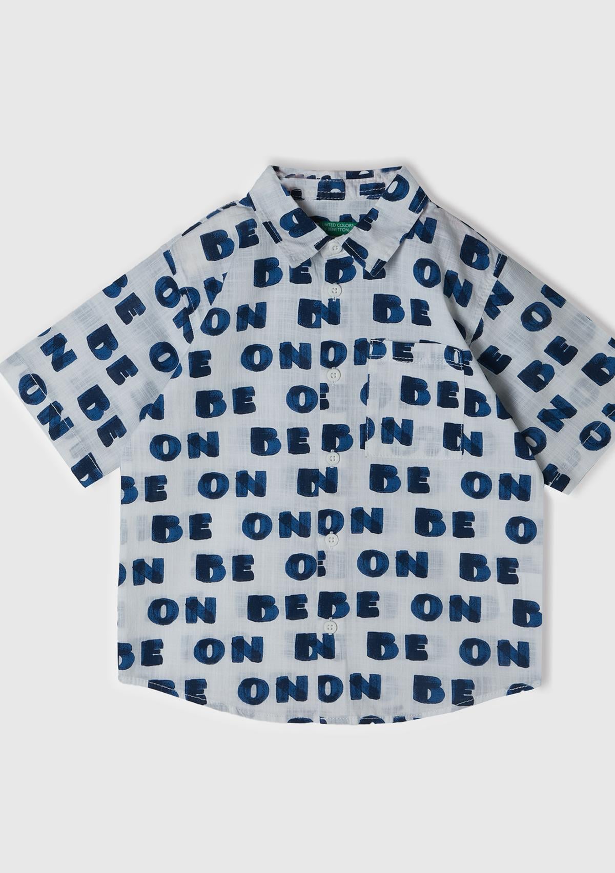 Erkek Çocuk Beyaz-Lacivert Tamamı Desenli Yama Cepli Kısa Kollu Gömlek
