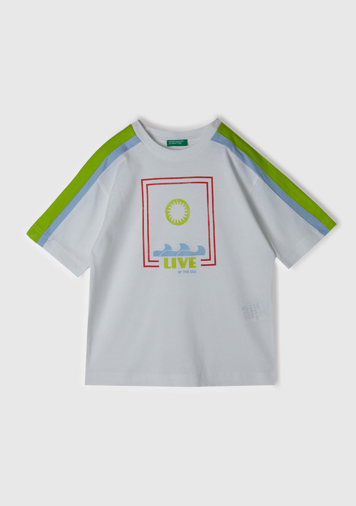 Erkek Çocuk Beyaz Önü Baskılı Omuzları Kontrast Şeritli Bisiklet Yaka T-Shirt