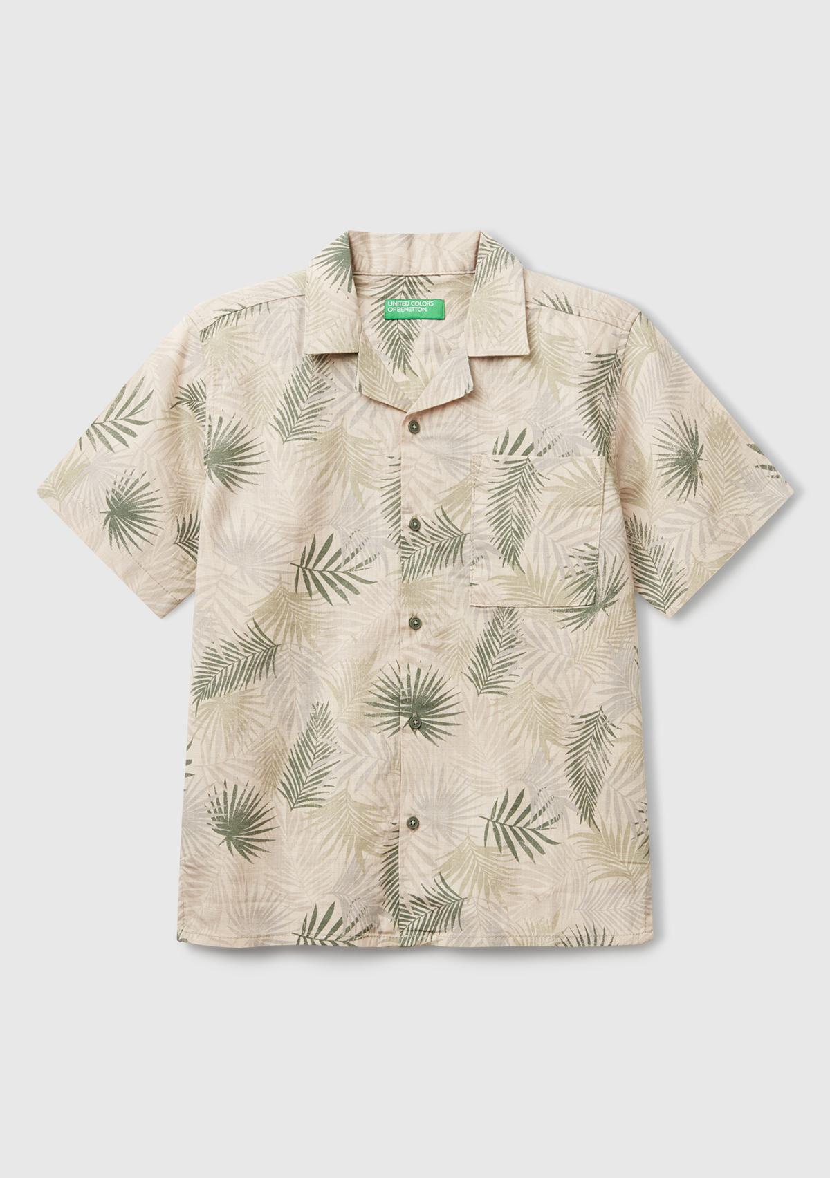 Erkek Çocuk Desenli Keten Karışımlı Tamamı Desenli Tek Cep Detaylı Kısa Kollu Gömlek