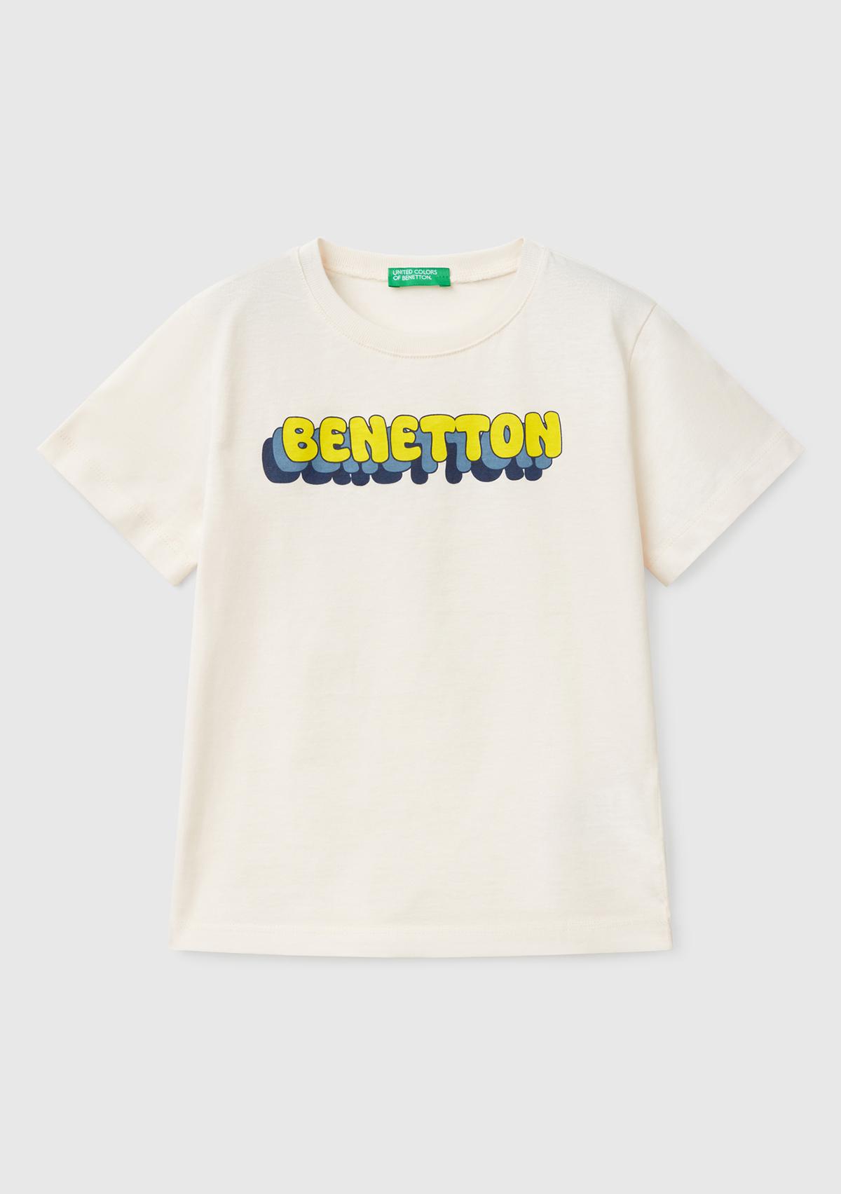 Erkek Çocuk Ekru Benetton Logo Baskılı T-Shirt