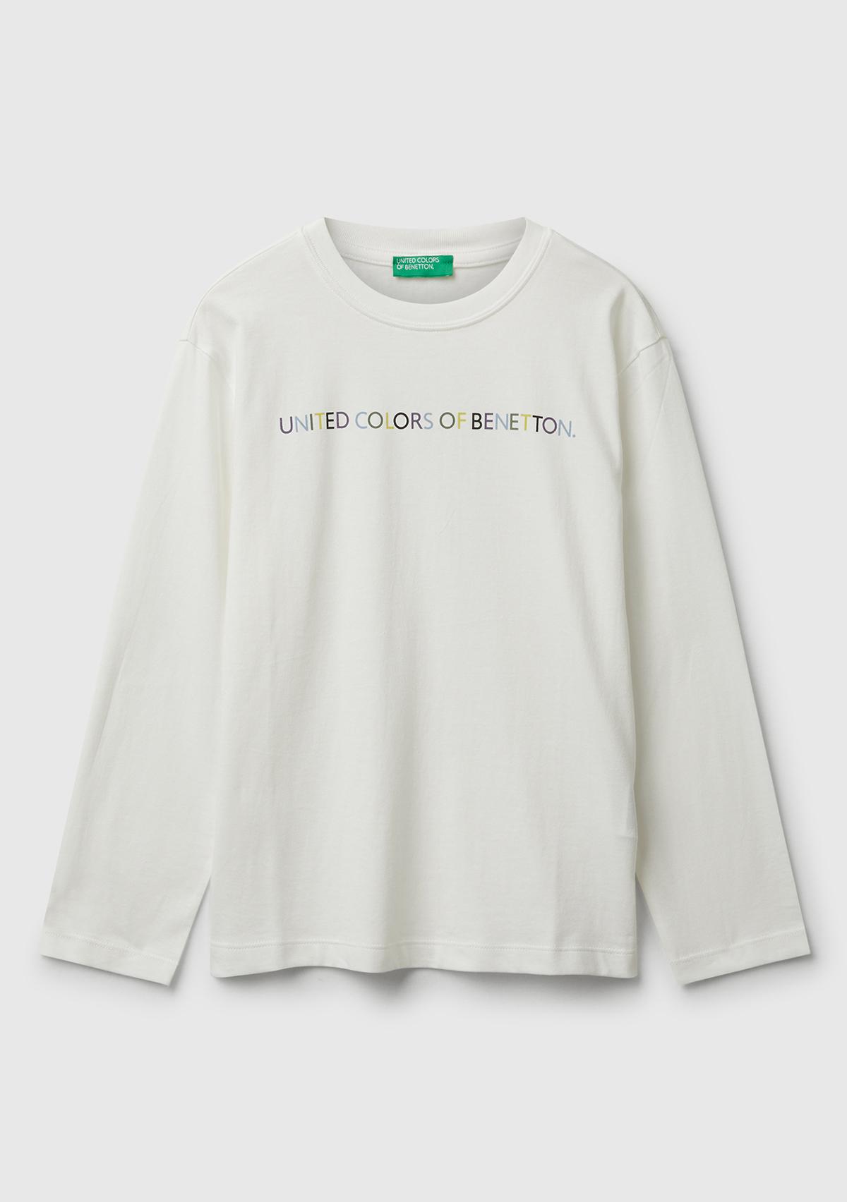 Erkek Çocuk Ekru Önü Logo Baskılı Bisiklet Yaka Jarse Uzun Kollu T-shirt