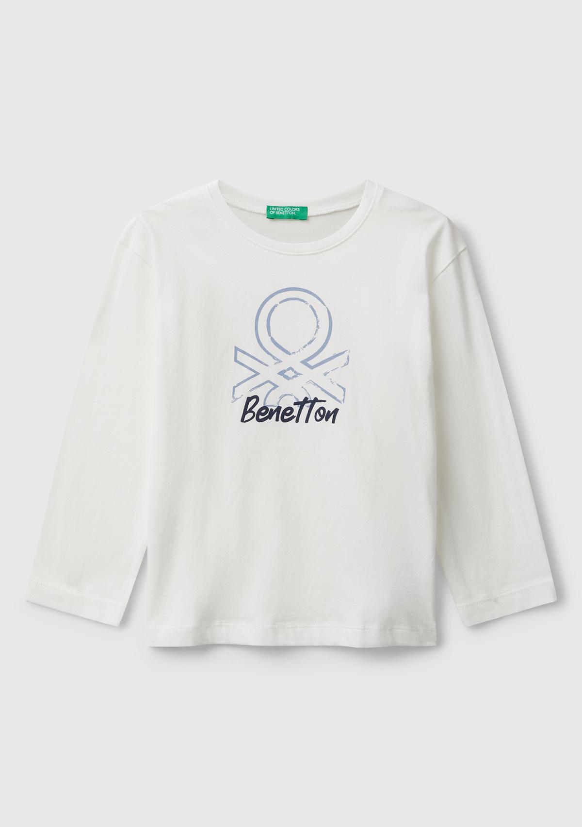 Erkek Çocuk Ekru Organik Pamuklu Önü Logo Baskılı Uzun Kollu Jarse T-shirt