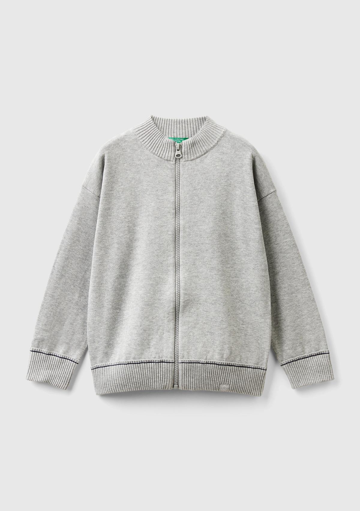 Erkek Çocuk Gri Melanj Etek Ucu Logo Detaylı Fermuarlı Dik Yaka Hırka