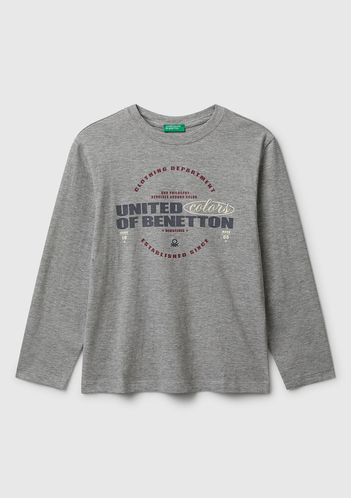 Erkek Çocuk Gri Melanj Önü Logo Baskılı Bisiklet Yaka Jarse Uzun Kollu T-shirt