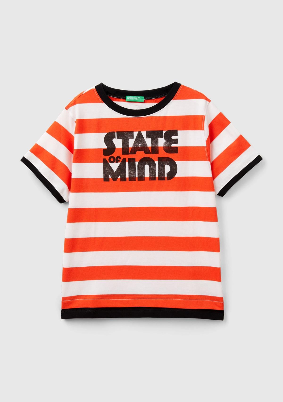 Erkek Çocuk Kırmızı-Beyaz Önü Baskılı Arkası Logo İşlemeli Yatay Çizgili T-Shirt