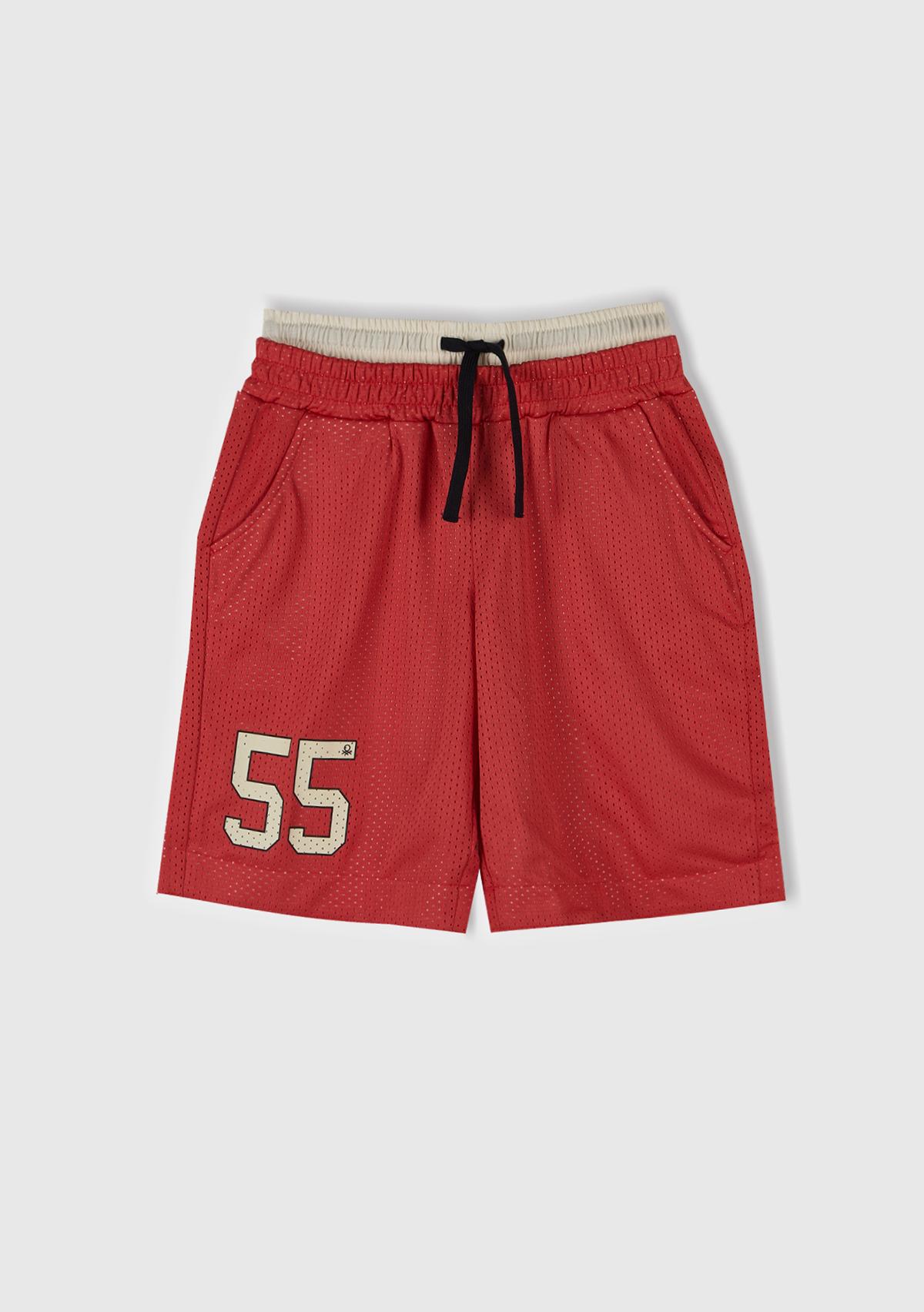 Erkek Çocuk Kırmızı File Kumaşlı Çift Bel Bantlı Oversize Basketbol Şortu
