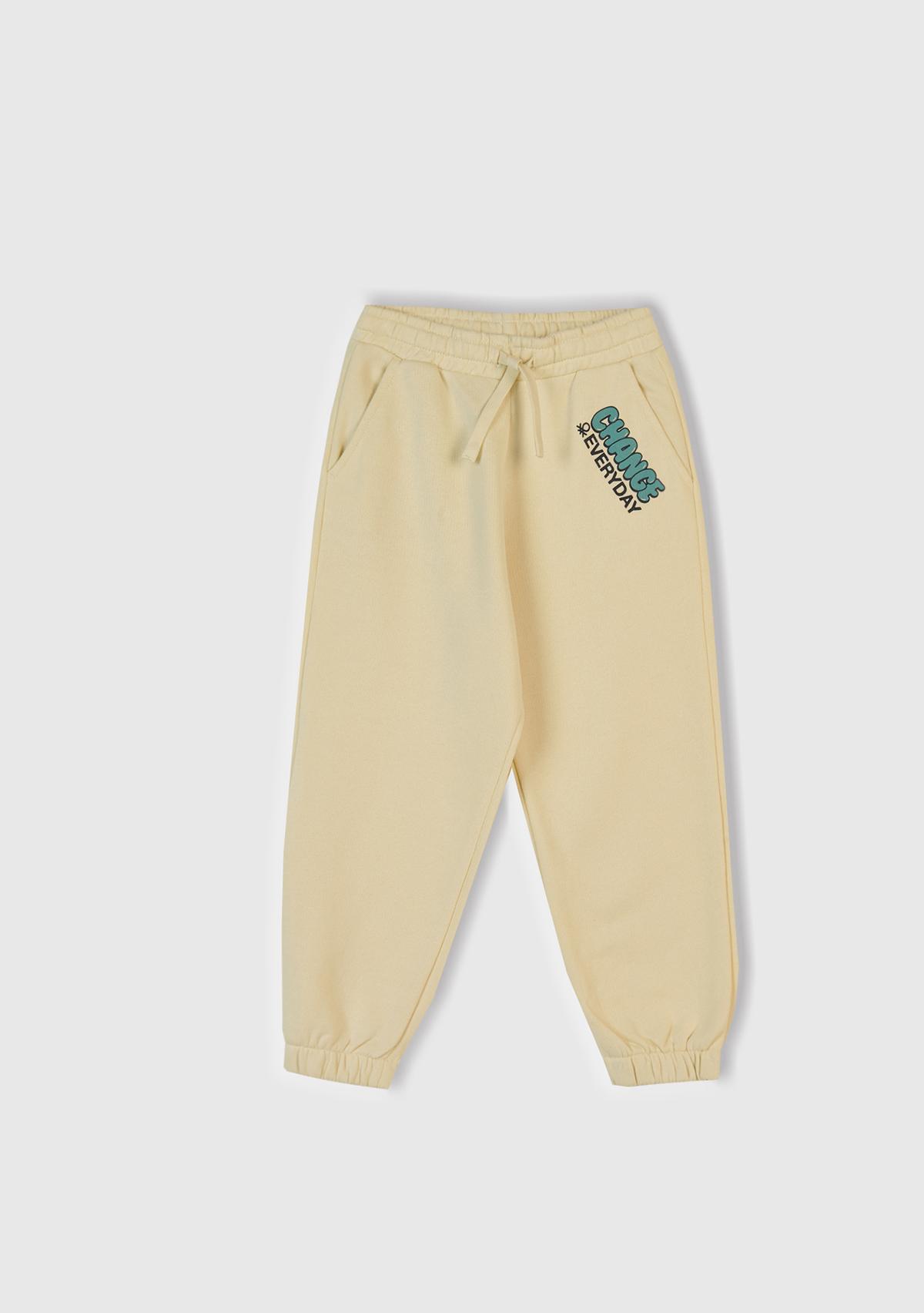 Erkek Çocuk Krem Baskılı Beli ve Bileği Lastikli İpli Eşofman Altı