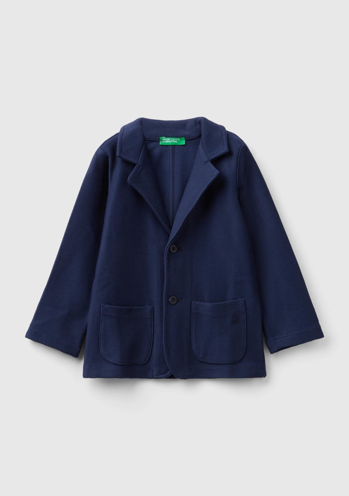 Erkek Çocuk Lacivert Düğme Kapamalı Yama Cepli Logo Baskılı Polar Blazer
