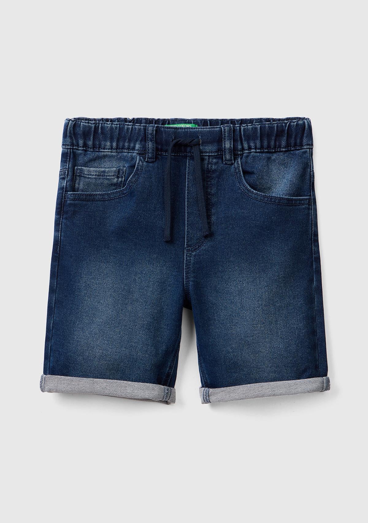 Erkek Çocuk Lacivert Logo İşlemeli 5 Cepli Beli İpli Ağartılmış Bermuda Şort