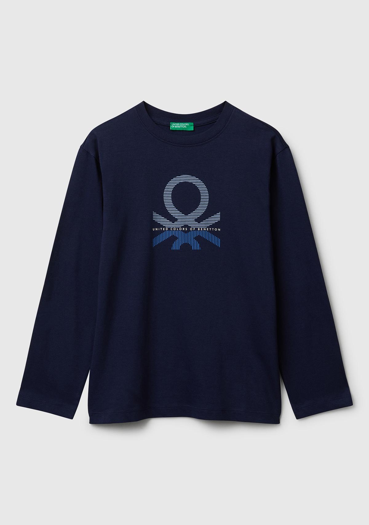Erkek Çocuk Lacivert Önü Logo Baskılı Bisiklet Yaka Jarse Uzun Kollu T-shirt