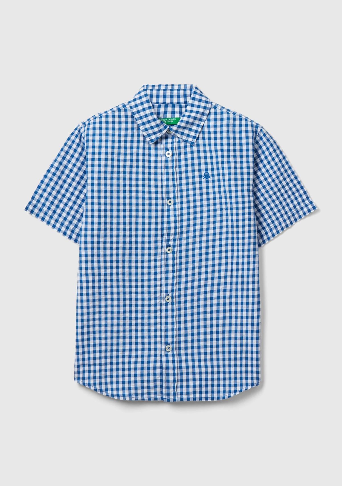 Erkek Çocuk Mavi-Beyaz Göğsü Logo İşlemeli Desenli Kısa Kollu Gömlek