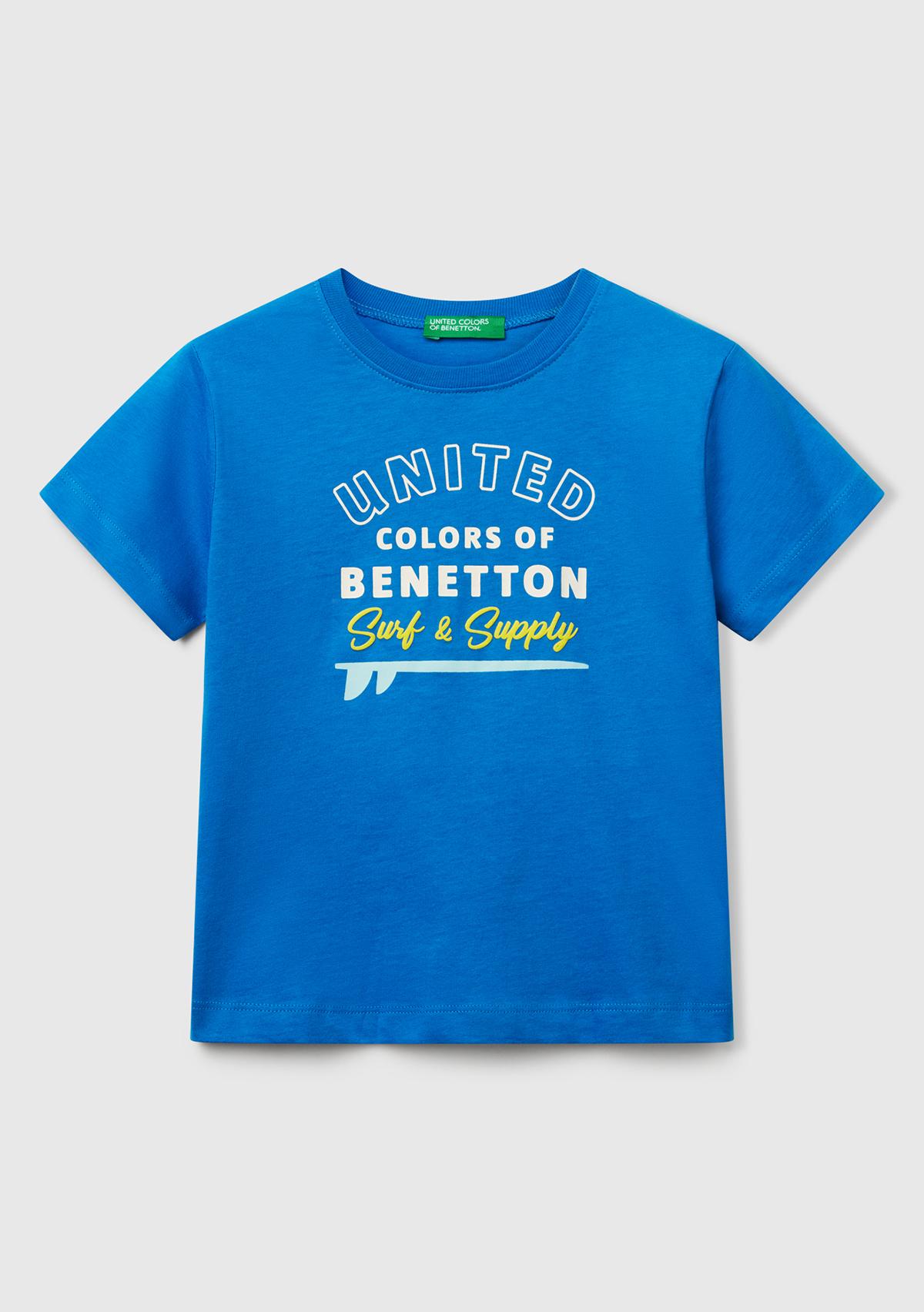 Erkek Çocuk Saks Mavi Benetton Logo Baskılı T-Shirt