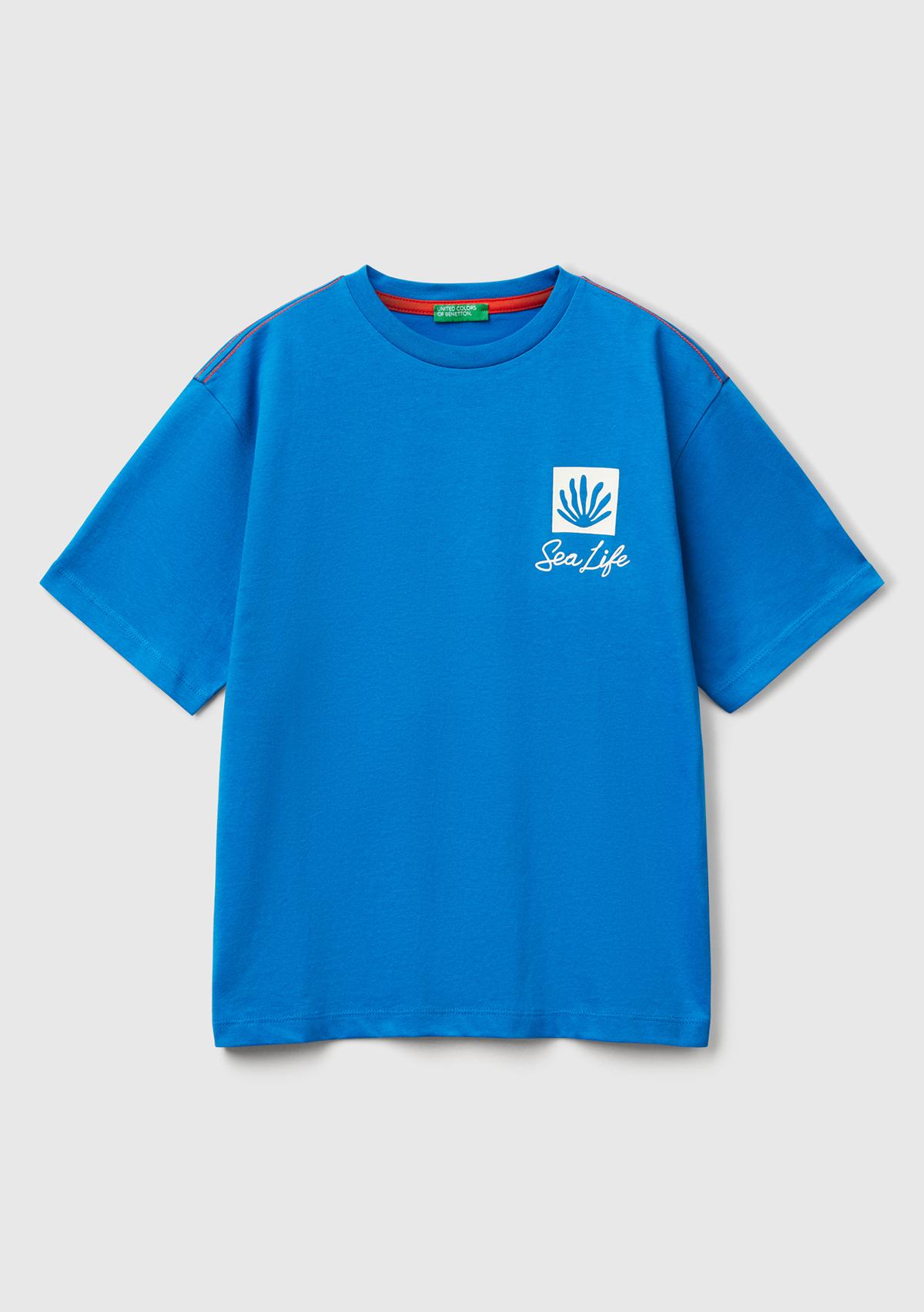 Erkek Çocuk Saks Mavi Slogan Baskılı Oversize T-Shirt