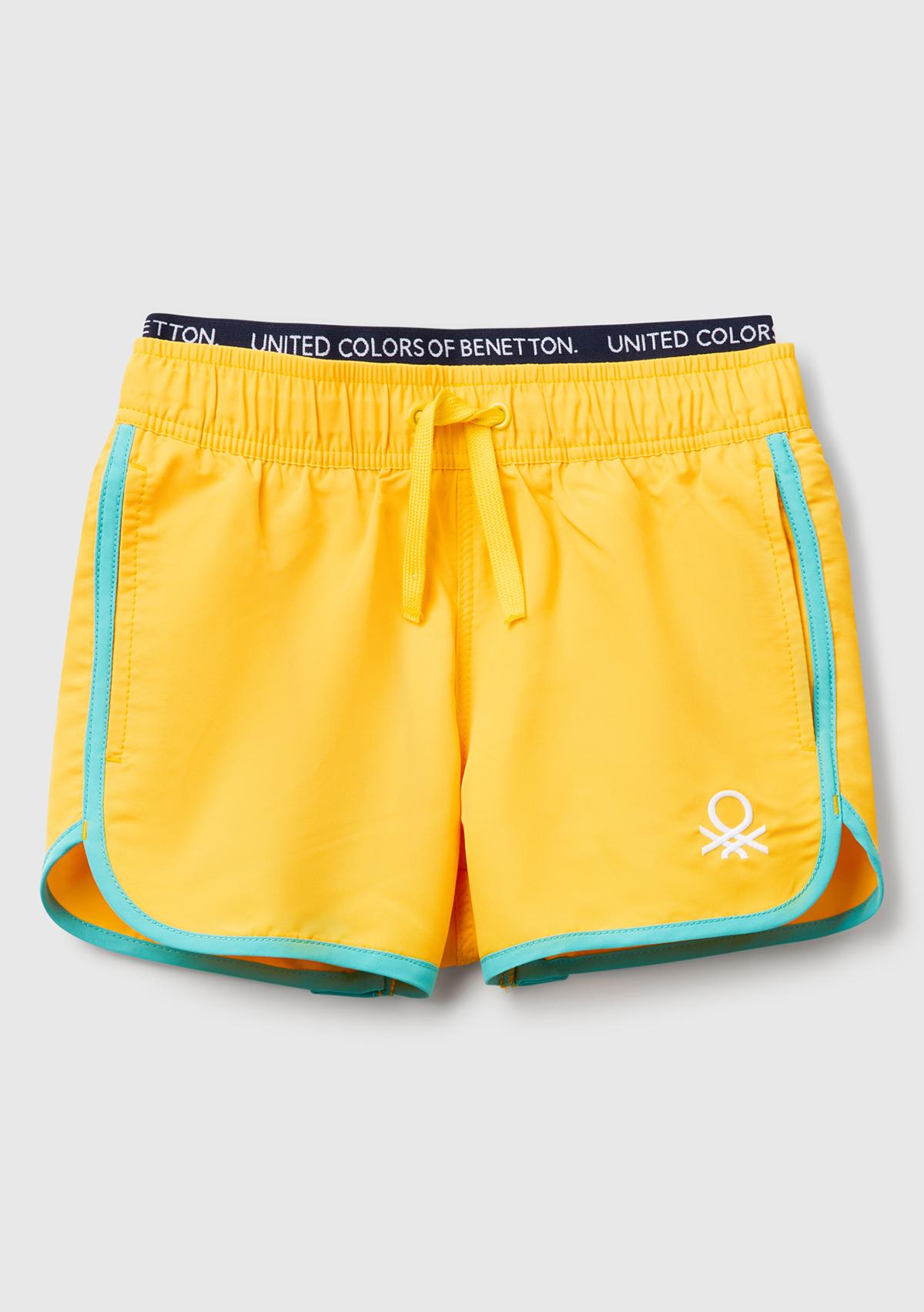 Erkek Çocuk Sarı Logo Baskılı Beli Lastik Detaylı Büzgü İpli Deniz Şortu