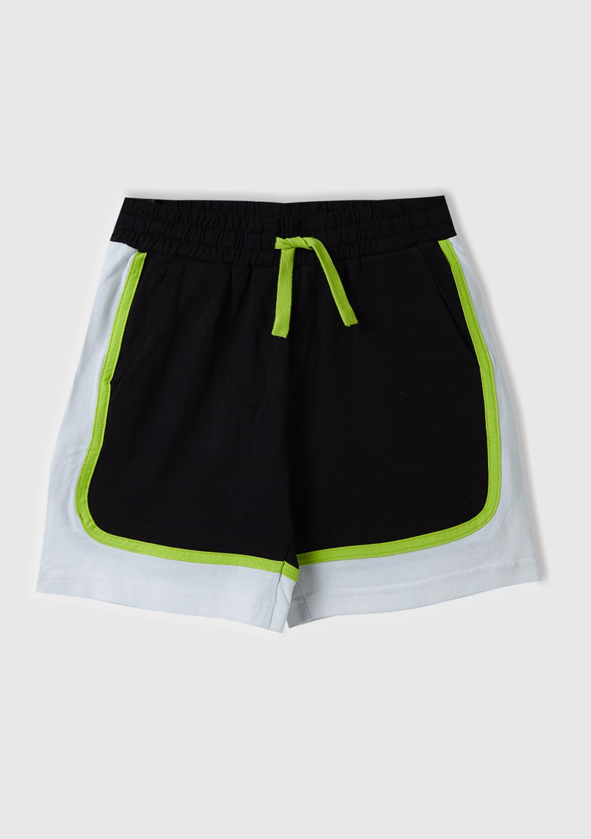 Erkek Çocuk Siyah Beli Büzgülü Arkası Logo İşlemeli Renk Bloklu Bermuda Şort