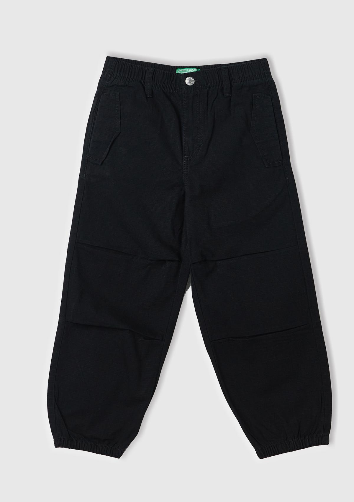 Saf pamuklu kumaştan üretilmiş, beli ve paçası büzgülü, fermuarlı ve çıtçıt düğmeli, beli kemer delikli, gadget detaylı erkek çocuk bol kesim pantolon. Ön kısmında kapaklı, arka kısmında biyeli cepleri bulunan bu rahat kesim pantolon, trend görünümüyle sokak stili için biçilmiş kaftan!