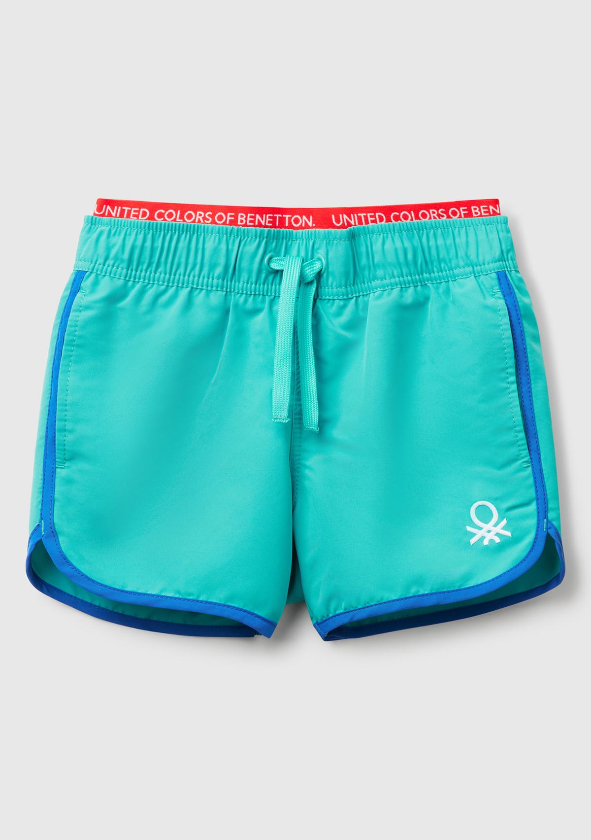Erkek Çocuk Turkuaz Logo Baskılı Beli Lastik Detaylı Büzgü İpli Deniz Şortu