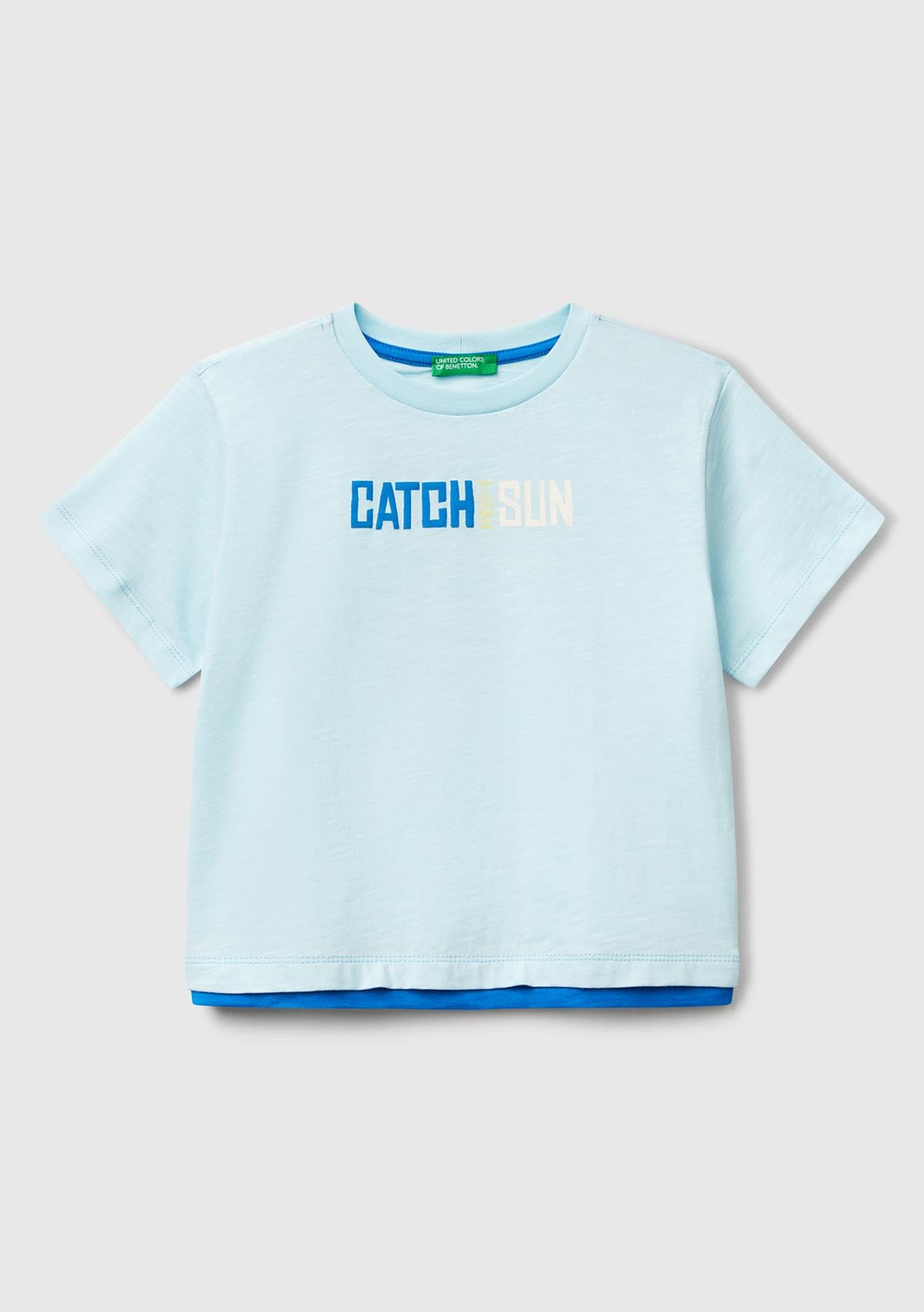 Erkek Çocuk Turkuaz Önü ve Arkası Baskılı Kabartmalı Kontrast Renkli T-Shirt