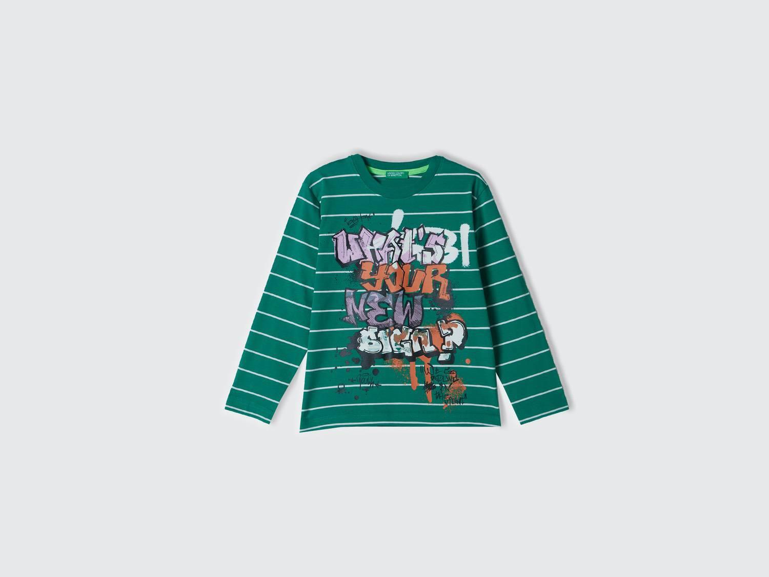 Erkek Çocuk Yeşil Önü Baskılı Çizgili Bisiklet Yaka Uzun Kollu T-Shirt