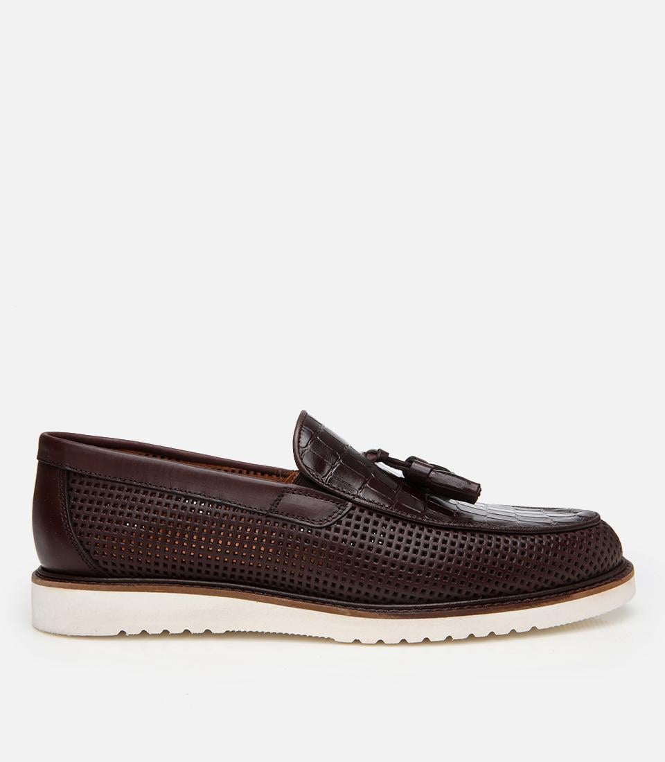 Erkek Deri Kahverengi Kroko Desenli Püskül Detaylı Günlük Loafer