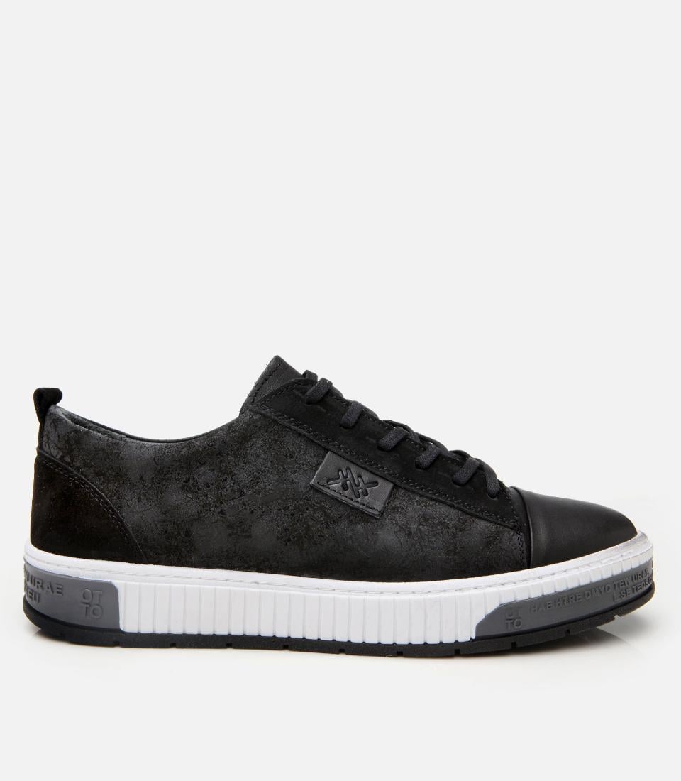 Erkek Deri Siyah Baskılı Spor Ayakkabı