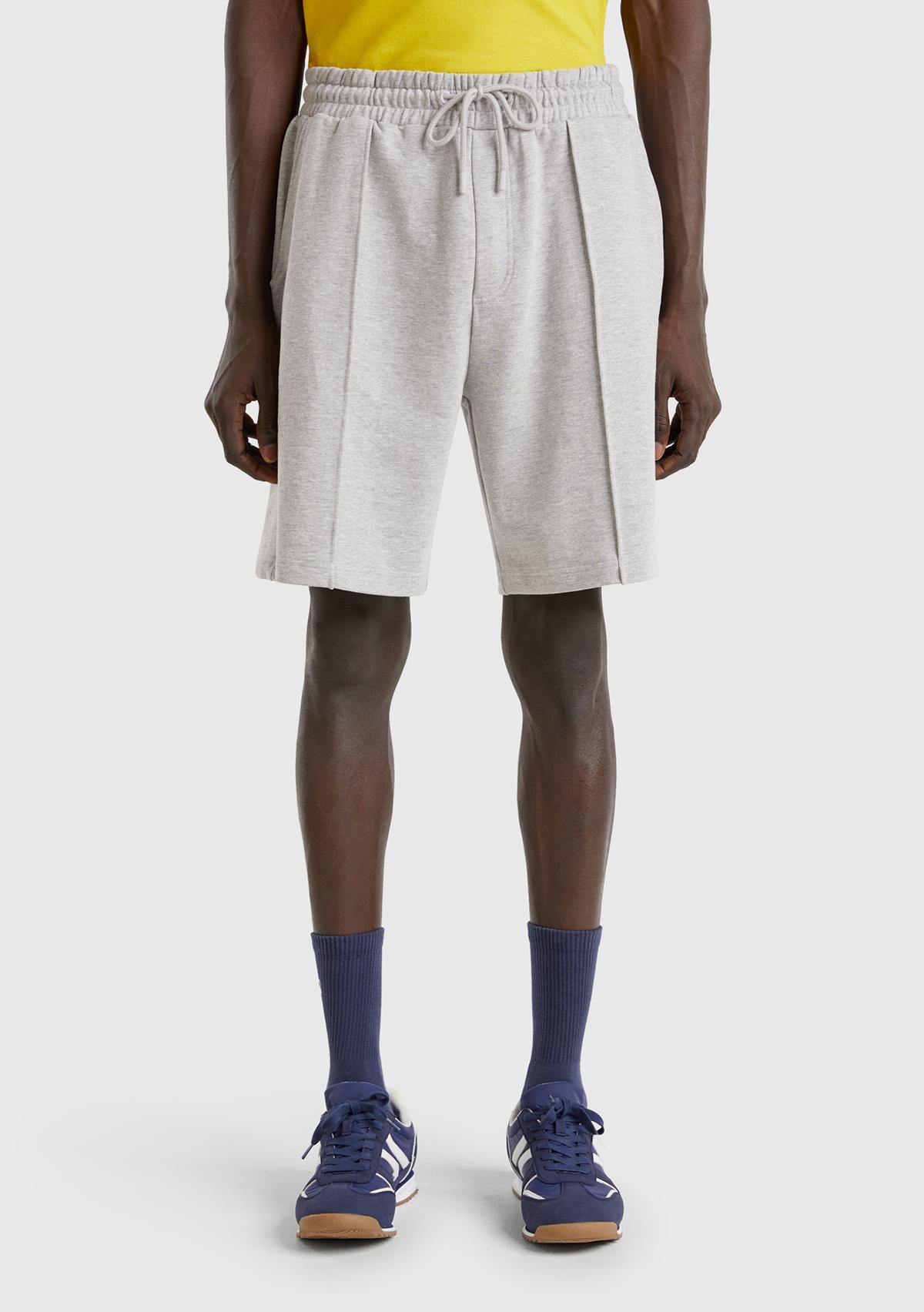 Erkek Gri Melanj %100 Pamuk Logo Detaylı Beli Büzgü İpli Bermuda Şort