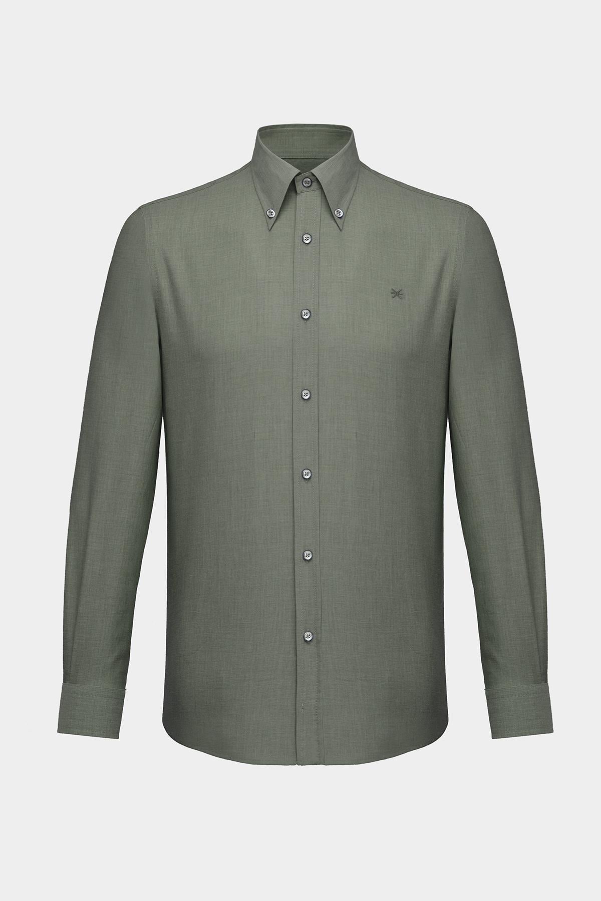 Erkek Haki Cooper Fit Düğmeli Yaka Kaşmir Karışımlı Flannel Spor Gömlek