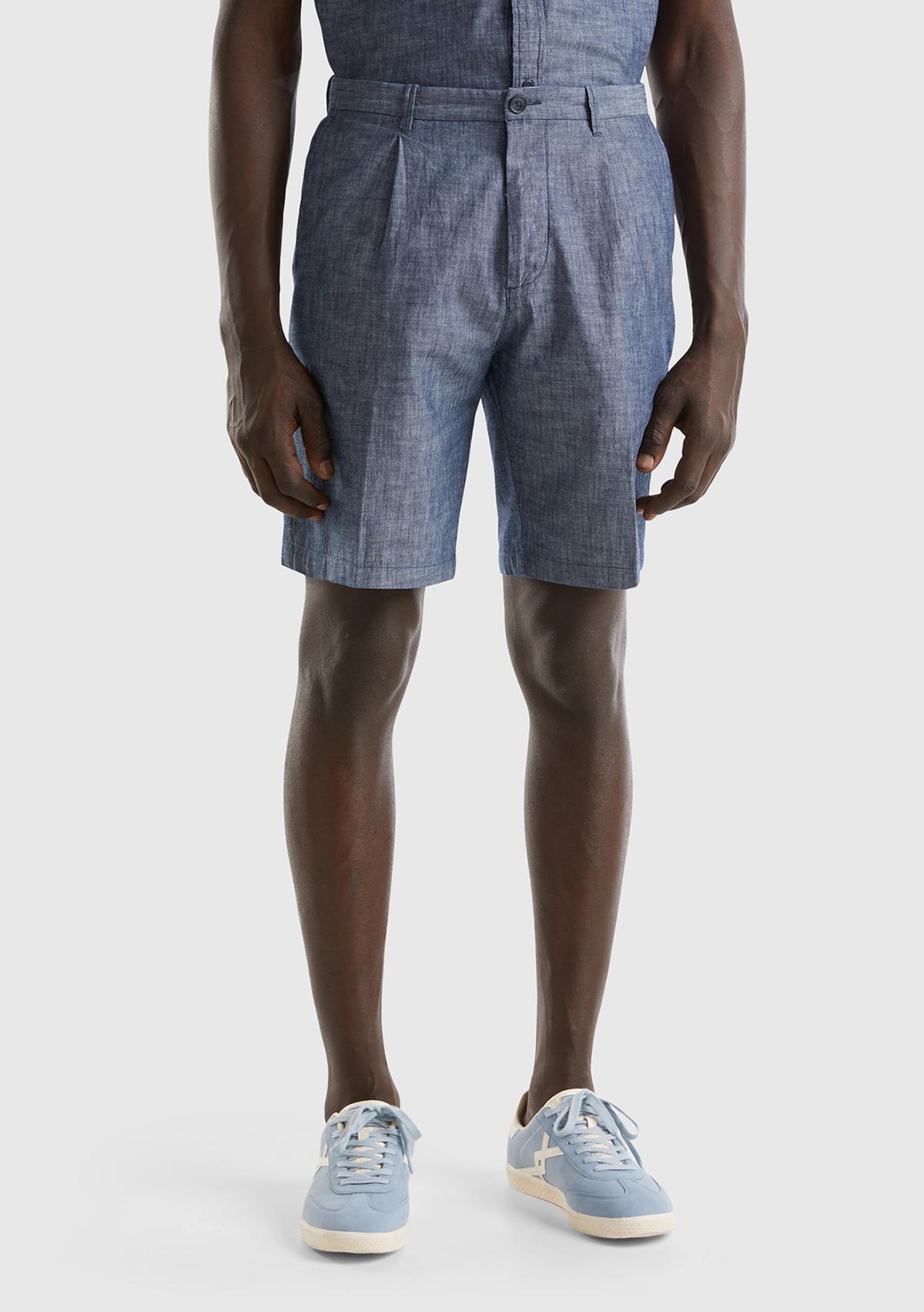 Erkek İndigo %100 Pamuk Önü Pileli Bermuda Şort