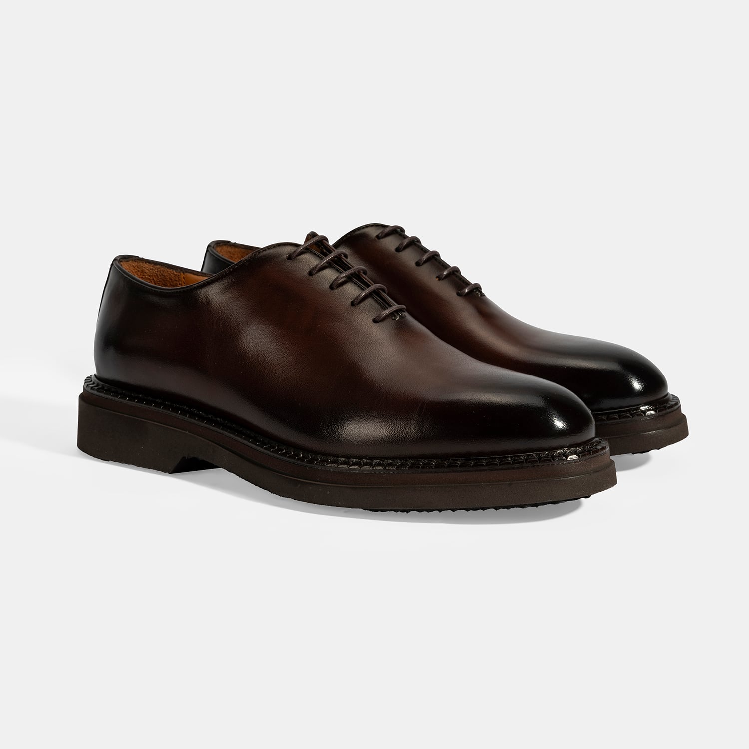%100 Dana derisinden üretilmiştir.-%100 deri dış yüzey, %100 deri astar ve mostrali; bağcıklı, EVA tabanlı erkek ayakkabı.