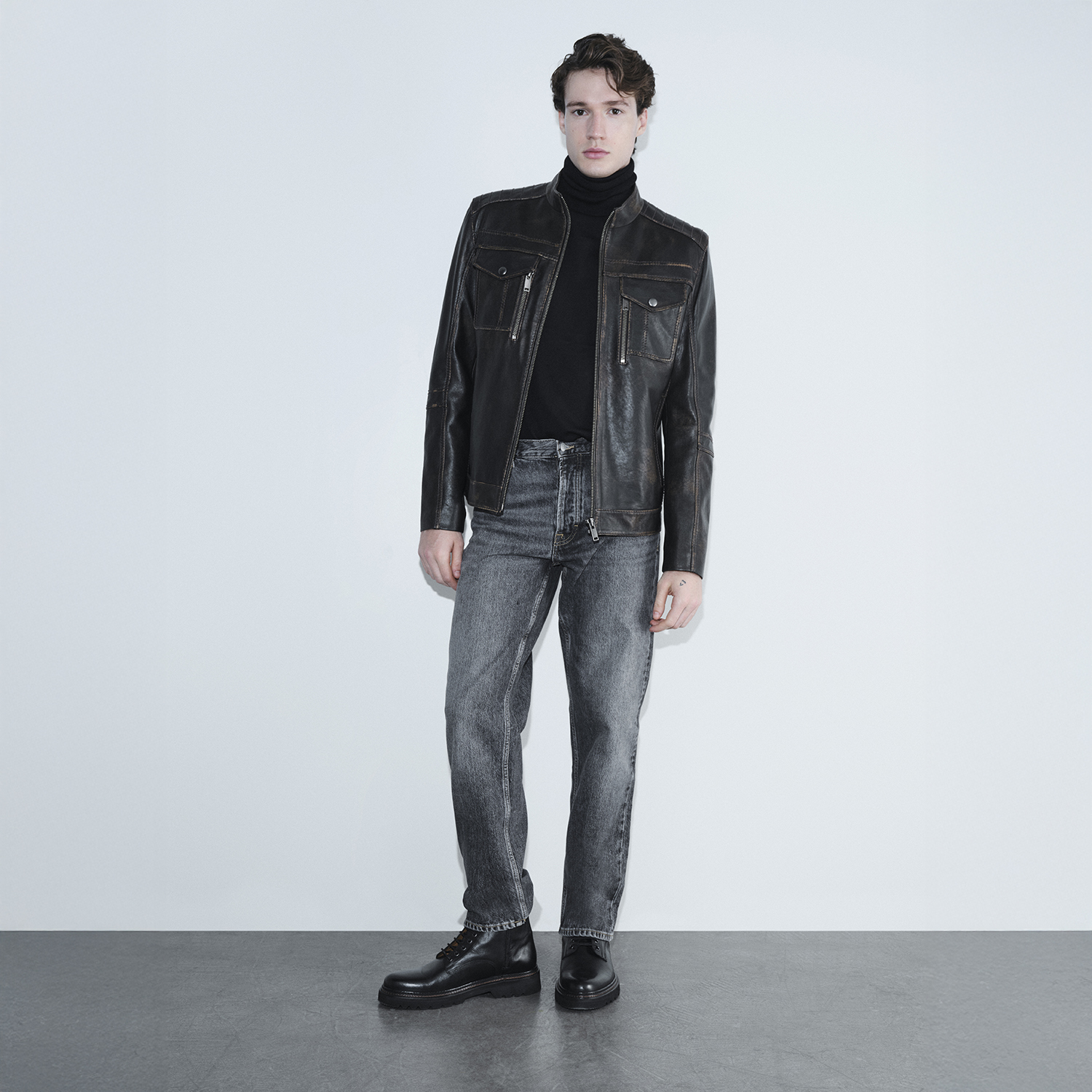 Erkek hakim yakalı eskitme deri ceket. Önden metal fermuar kapamalıdır. Ön üstte iki adet üstten girişli kapaklı cep ve yine ön üstte iki adet yandan girişli fermuarlı cep mevcuttur. Önde ayrıca iki adet yandan girişli kalın fleto cep bulunmaktadır. İç kısmında bir adet düğmeli gizli cep yer almaktadır. Arka kısmının her iki yanında metal çıtçıtlı ayar bantları mevcuttur. Omuzlarında dekoratif dikiş detayları kullanılmıştır. Özel el işçiliği ile derinin üzerine bölgesel açma işlemleri yapılarak vintage bir hava verilmiştir. Her ürün, elde özel işçilikle eskitme işlemi uygulanarak üretilmiştir. Bu nedenle her biri eşsiz ve tektir. Model aynı olmakla birlikte, deri görünümü ve dokusu görseldeki ile birebir aynı olmayabilir. %100 koyun derisinden üretilmiş olup astarlıdır. Model Bilgisi: Modelimizin ölçüleri: Boy 183 cm, Göğüs 95 cm, Bel 76 cm, Kalça 92 cm. Mankenin üzerindeki ürün M bedendir.-Erkek hakim yakalı eskitme deri ceket. Önden metal fermuar kapamalıdır. Ön üstte iki adet üstten girişli kapaklı cep ve yine ön üstte iki adet yandan girişli fermuarlı cep mevcuttur. Önde ayrıca iki adet yandan girişli kalın fleto cep bulunmaktadır. İç kısmında bir adet düğmeli gizli cep yer almaktadır. Arka kısmının her iki yanında metal çıtçıtlı ayar bantları mevcuttur. Omuzlarında dekoratif dikiş detayları kullanılmıştır. Özel el işçiliği ile derinin üzerine bölgesel açma işlemleri yapılarak vintage bir hava verilmiştir. Her ürün, elde özel işçilikle eskitme işlemi uygulanarak üretilmiştir. Bu nedenle her biri eşsiz ve tektir. Model aynı olmakla birlikte, deri görünümü ve dokusu görseldeki ile birebir aynı olmayabilir. %100 koyun derisinden üretilmiş olup astarlıdır. Model Bilgisi: Modelimizin ölçüleri: Boy 183 cm, Göğüs 95 cm, Bel 76 cm, Kalça 92 cm. Mankenin üzerindeki ürün M bedendir.
