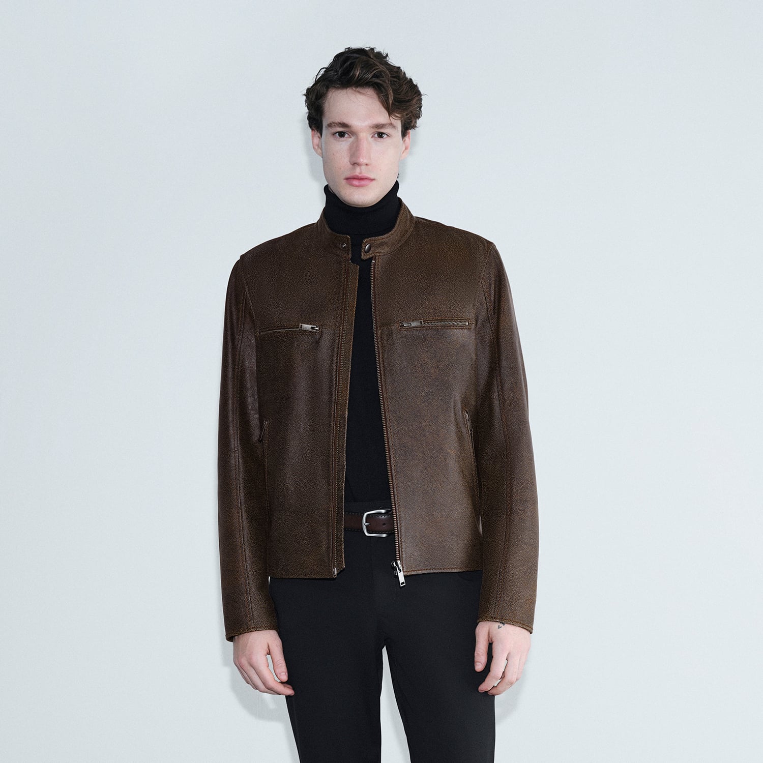 Erkek hakim yakalı fit spor deri ceket. Yakasında metal çıtçıt kapama mevcuttur. Önden metal fermuar kapamalıdır. Önde iki adet yandan girişli metal fermuarlı ve ön üstte iki adet üsten girişli metal fermuarlı cebi mevcuttur. İç kısmında bir adet düğmeli gizli cep bulunmaktadır. Özel baskı işçiliği ile tepeli eskitme işlemi yapılarak üretilmiştir. Her biri eşsiz ve tektir. Model aynı olmakla beraber, deri görünümü ve dokusu görseldeki ile aynı olmayabilir. %100 koyun derisi olup, astarlı çalışılmıştır.-Erkek hakim yakalı fit spor deri ceket. Yakasında metal çıtçıt kapama mevcuttur. Önden metal fermuar kapamalıdır. Önde iki adet yandan girişli metal fermuarlı ve ön üstte iki adet üsten girişli metal fermuarlı cebi mevcuttur. İç kısmında bir adet düğmeli gizli cep bulunmaktadır. Özel baskı işçiliği ile tepeli eskitme işlemi yapılarak üretilmiştir. Her biri eşsiz ve tektir. Model aynı olmakla beraber, deri görünümü ve dokusu görseldeki ile aynı olmayabilir. %100 koyun derisi olup, astarlı çalışılmıştır.