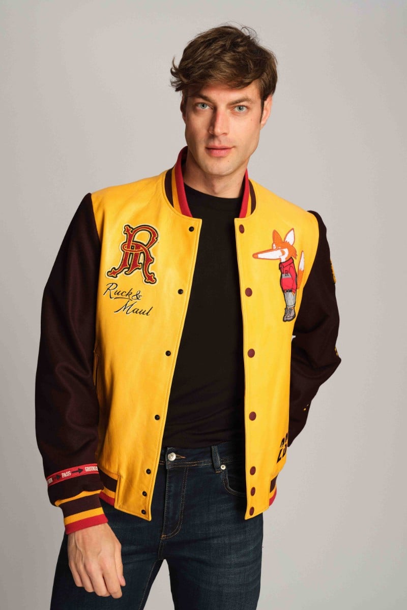 Uni-Lederjacke mit Kragen, Wappen und Stickerei.%100 LeatherNicht waschen. Nur für die chemische Reinigung geeignet.