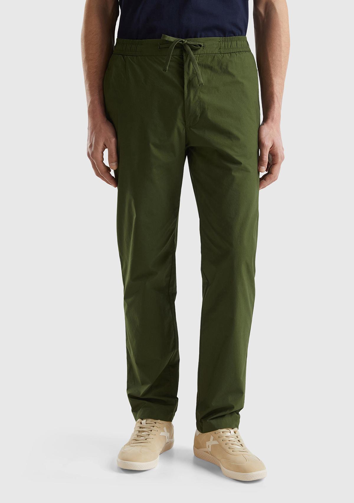 Erkek Koyu Yeşil %100 Pamuk 4 Cepli Beli Büzgülü İpli Pantolon