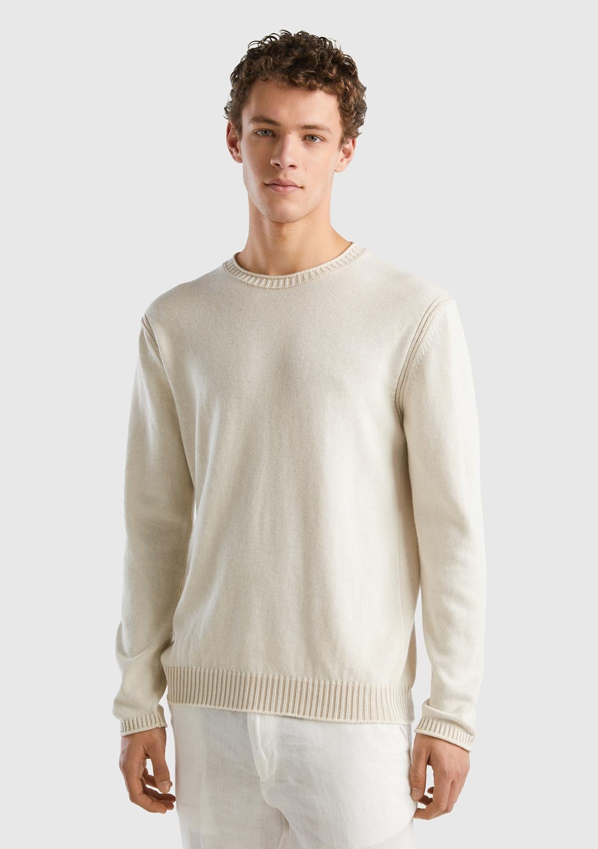 Erkek Krem Pamuk Karışımlı Bisiklet Yaka Basic Kazak