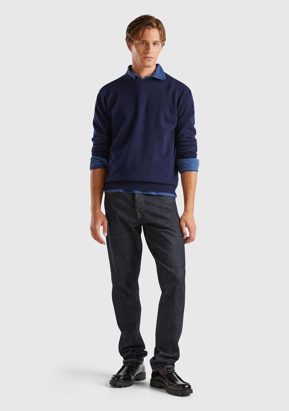 Erkek Lacivert %100 Kaşmir Normal Kesim Ribanalı Yuvarlak Yaka Kazak. Keçi Yünü İçerir