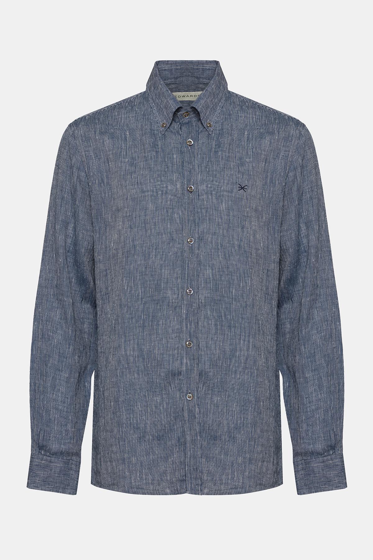 Erkek Lacivert Cooper Fit Düğmeli Yaka Keten Gömlek