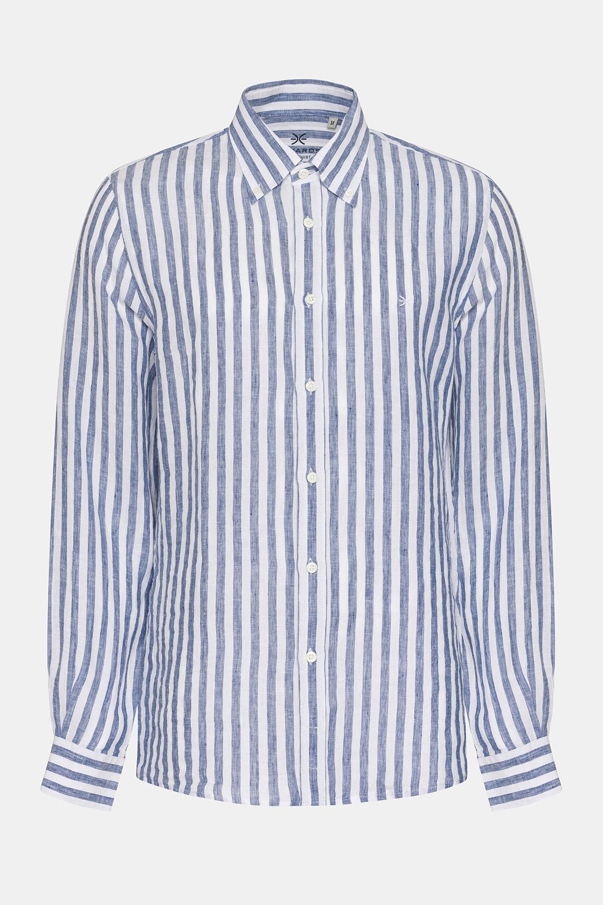 Erkek Lacivert Düğmeli Yaka Cooper Fit İrlanda Keten Gömlek