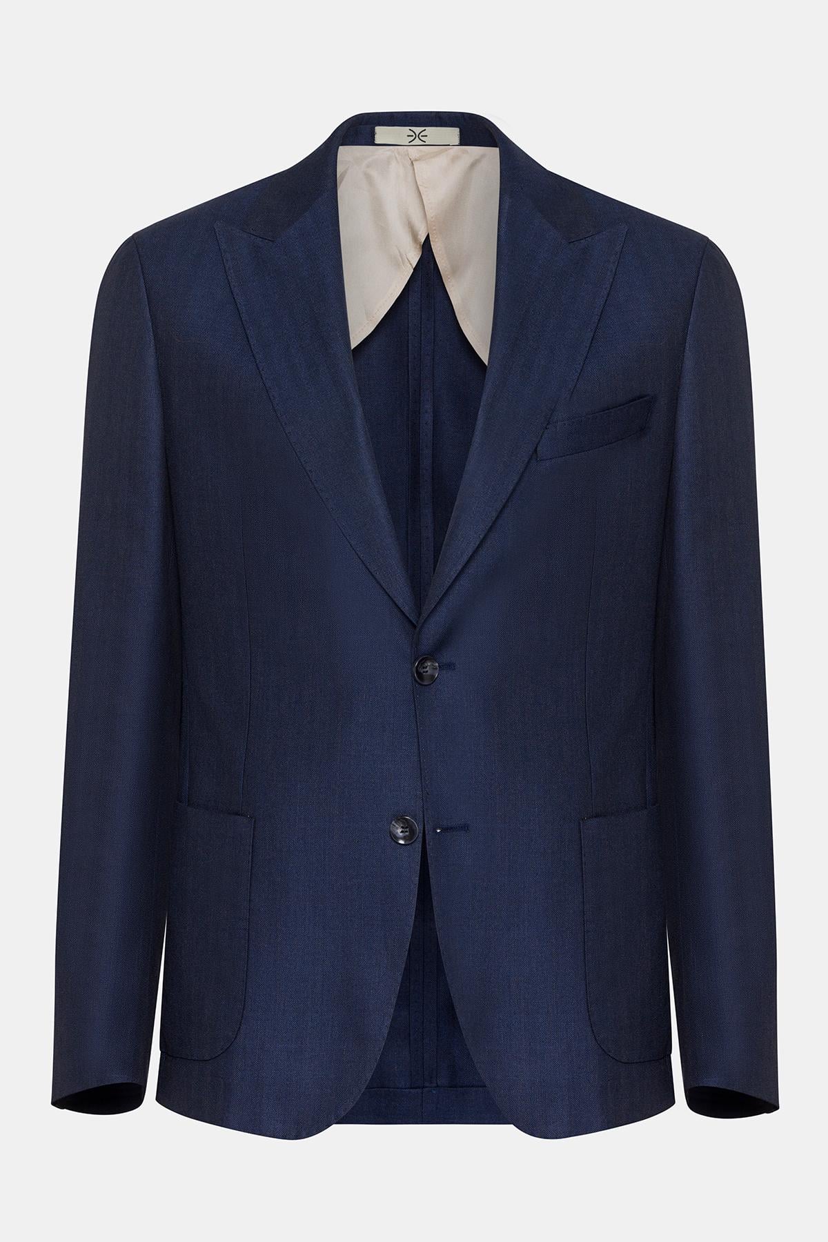 Erkek Lacivert Loro Piana Kumaşıyla Üretilmiş Yün İpek Karışımlı Casual Ceket