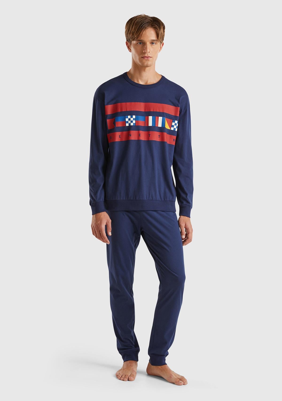 Erkek Lacivert Pamuk Karışımlı Üstü Baskılı Altı Arka Cepli Pijama Takımı
