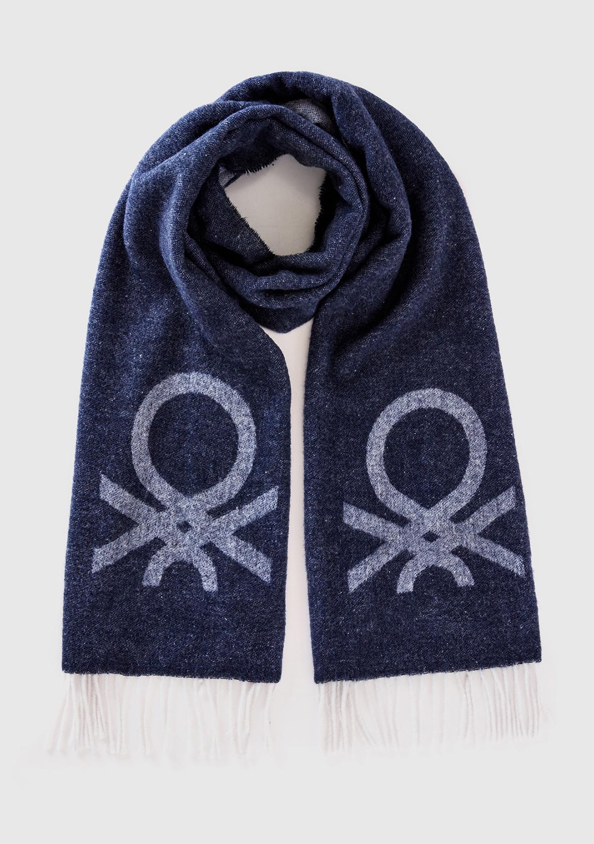 Erkek Lacivert Yün Karışımlı Kontrast Renkli Logo Baskılı Atkı