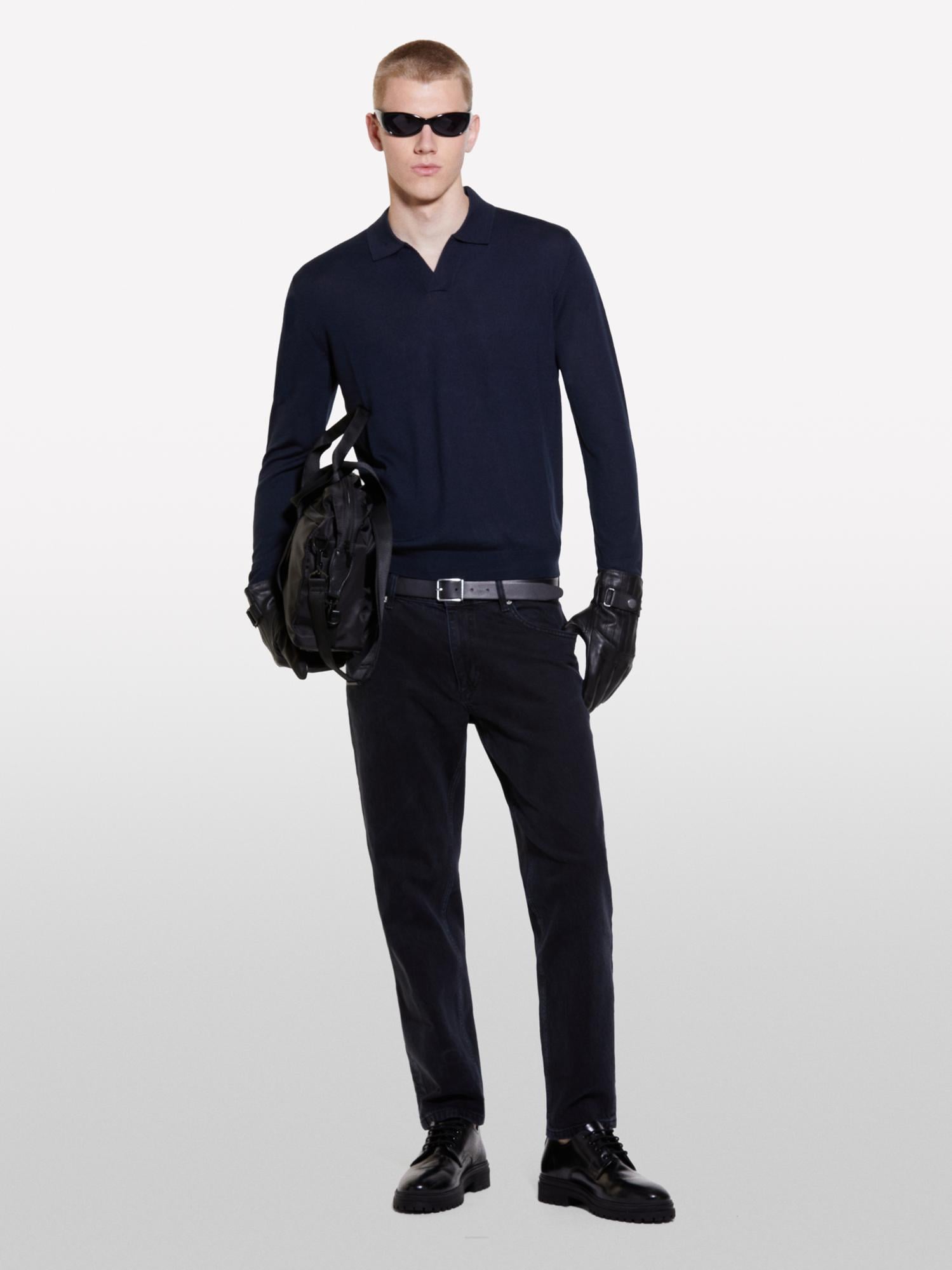 Erkek Lacivert Yün Karışımlı Normal Kesim Uzun Kollu Polo Yaka T-Shirt